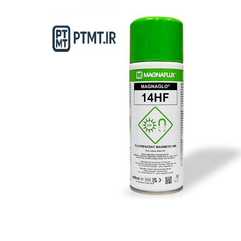 اسپری فلورسنتی مگنوفلاکس کد 14HF یک محلول آماده مصرف برای بازرسی غیرمخرب (NDT) با روش ذرات مغناطیسی است. این اسپری مخصوص آشکارسازی ترکها و ناپیوستگیهای سطحی در بخشهای ferromagnetic طراحی شده و زیر نور ماوراءبنفش نقاط عیبی را بهصورت درخشان نشان میدهد