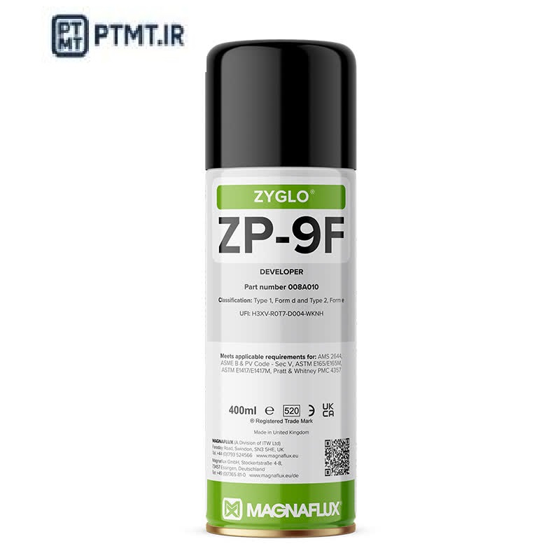 اسپری ترک یاب دولوپر MAGNAFLUX DEVELOPER ZP-9F ساخت کشور انگلستان با کد ZP-9F یک اسپری دولوپر سلونت Solvent می باشد. از این اسپری در ظاهر سازی پنترنت فلورسنت در تست مایعات نافذ PT استفاده میگردد.